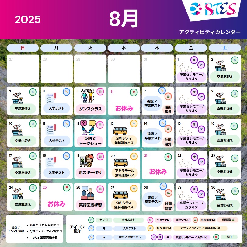 フィリピン留学 セブ島の語学学校BTESから、アクティビティカレンダーが届きました。
