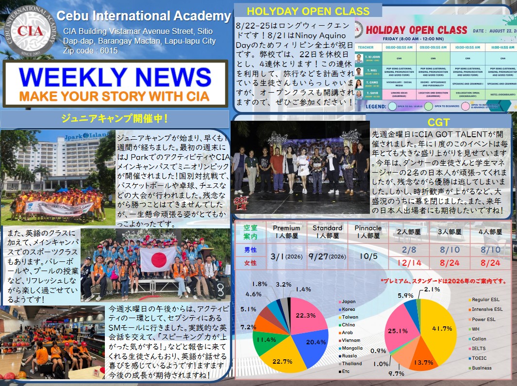 フィリピン セブ島にある語学学校CIAは、大規模ならではの充実したカリキュラムと豊富なアクティビティが特徴の人気校です!祝日もオープンクラスを実施しております。